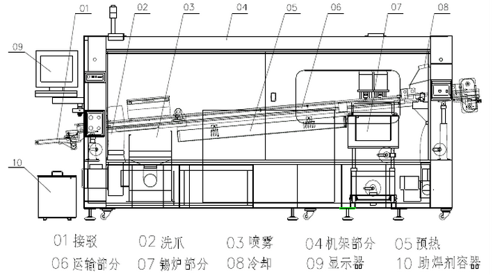 波峰焊機(jī)由運(yùn)輸系統(tǒng)、助焊劑涂覆系統(tǒng)、預(yù)熱系統(tǒng)、焊接系統(tǒng)、冷卻系統(tǒng)、電氣控制系統(tǒng)等幾大塊組成。