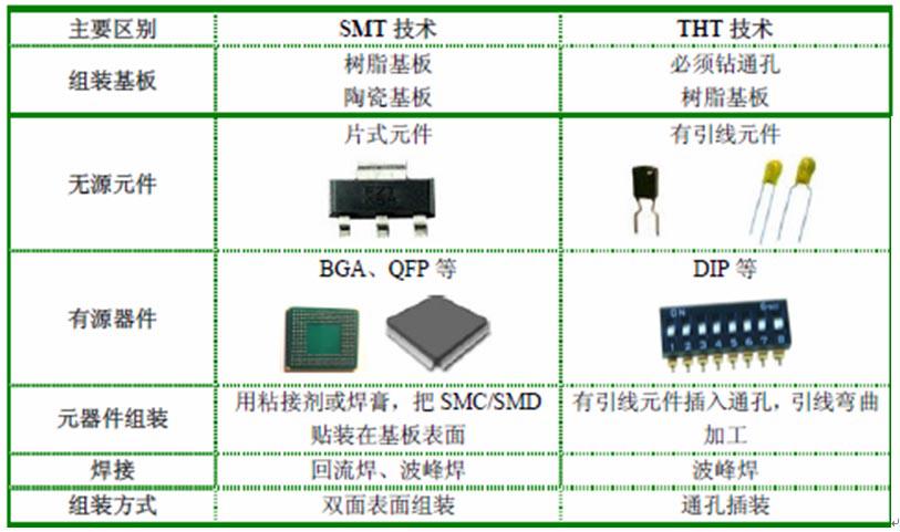 從組裝工藝技術(shù)的角度分析,SMT 技術(shù)和THT 技術(shù)的根本區(qū)別是“貼”和 “插”。兩者的差別還體現(xiàn)在基板、元器件、組件形態(tài)、焊點(diǎn)形態(tài)和組裝工藝各個(gè)方面, SMT 技術(shù)和THT 技術(shù)的主要區(qū)別如下所示: