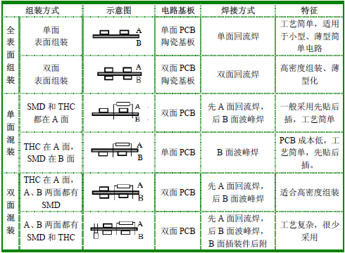 以主流的 SMT 組裝方式為例,SMT 的組裝方式及其工藝流程主要取決于表面組裝器件(SMA)的類型、使用的元器件種類和組裝設(shè)備條件。大體上可將SMA 分成單面組裝、雙面組裝和全表面組裝3 種類型共6 種組裝方式,具體如下所示: