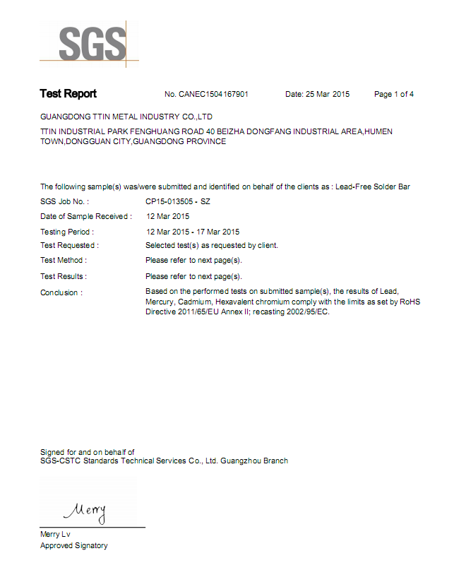 附件一 用于新型波峰焊機(jī)環(huán)保焊錫SGS報(bào)告證書